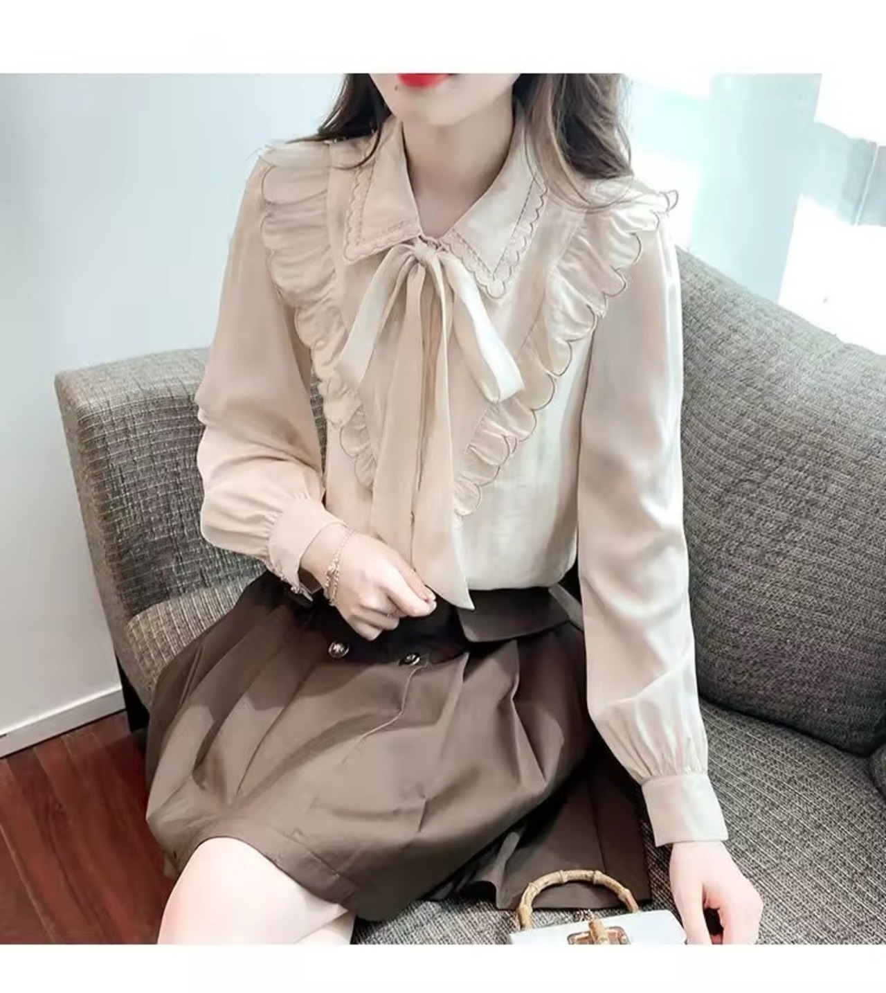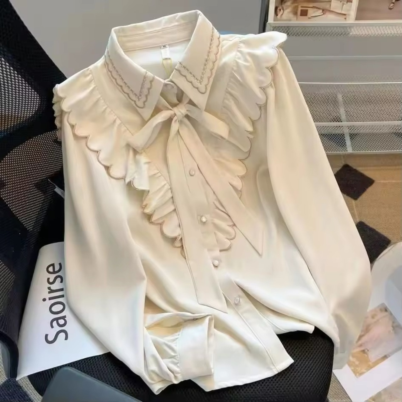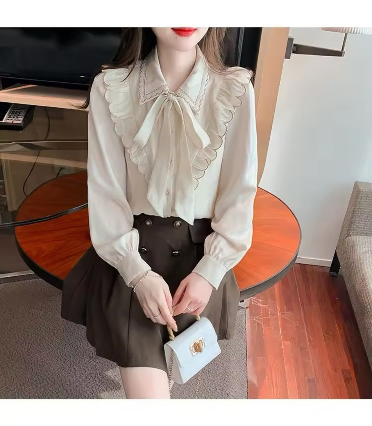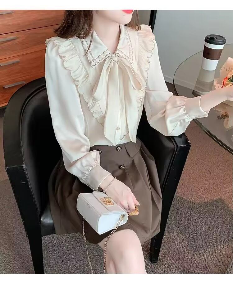 フロントからバックスタイルにかけてのスカラップと、リボンがアクセントのブラウス。